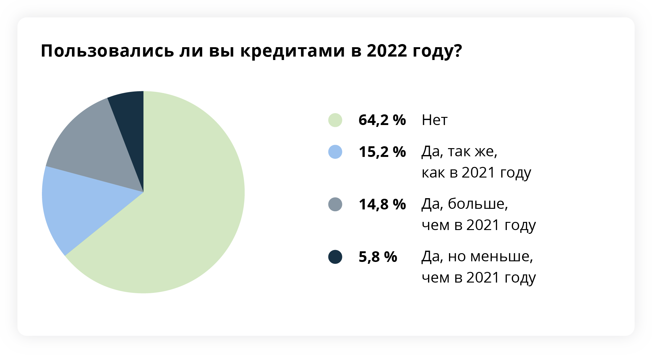 Несмотря на тяжелое финансовое положение, о котором написали многие ответившие, только 15 % в 2022 году стали больше пользоваться кредитами, чем в 2021-м. У большинства участников опроса кредитов по-прежнему нет.