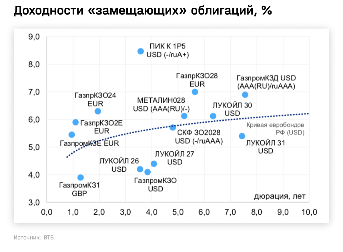 - На вторичном рынке «замещающие» облигации предлагают интересные доходности (~5–8% годовых), что выше околонулевых банковских депозитов и доходностей недавно появившихся локальных облигаций в юанях (~3–4% годовых).