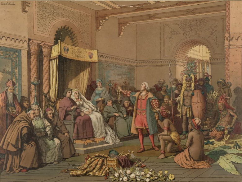 Барселона, 1493: Христофор Колумб представляет «католическим королям» Фердинанду и Изабелле шестерых жителей Нового света, которых он в числе прочих сокровищ привез из своей первой экспедиции. Литография Виктора Сирлза, 1893