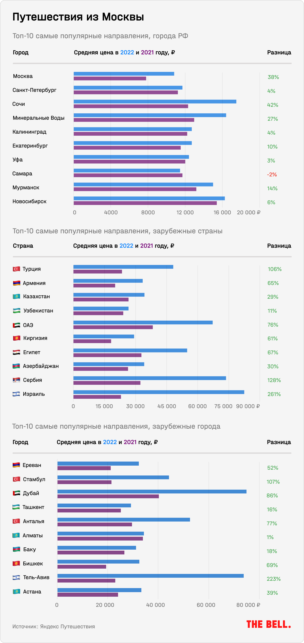 По оценке собеседника The Bell, знакомого с подробной статистикой туристической отрасли, в среднем стоимость билета на рейсы из России в Европу выросла с довоенных €400 до €1000–1500. Время в пути увеличилось со средних 3–4 часов до 8–24 часов, отмечают эксперты отрасли. Основной фактор подорожания — необходимость пересадки через популярные хабы вроде Стамбула, Еревана, Астаны и других третьих стран.