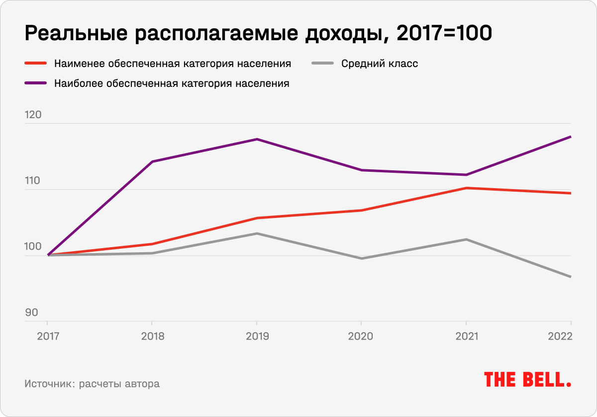 Средний класс стал главной экономически пострадавшей в результате войны группой населения России. Всего по итогам 2022 года реальные располагаемые доходы россиян снизятся на 2,2%, прогнозирует Минэкономразвития. Они упали на 1,2% год к году в первом квартале, на 0,8% во втором и на 3,4% в третьем (данных за четвертый квартал еще нет). При этом доходы среднего класса по итогам первого полугодия (то есть еще без учета провального третьего квартала) снизились на 5% год к году, подсчитал для The Bell аналитик одной из крупнейших российских инвесткомпаний на основании данных Росстата.