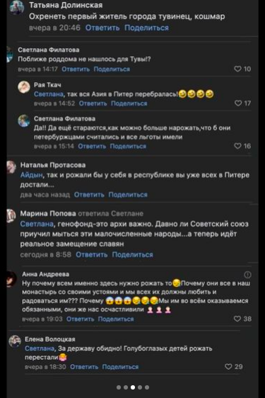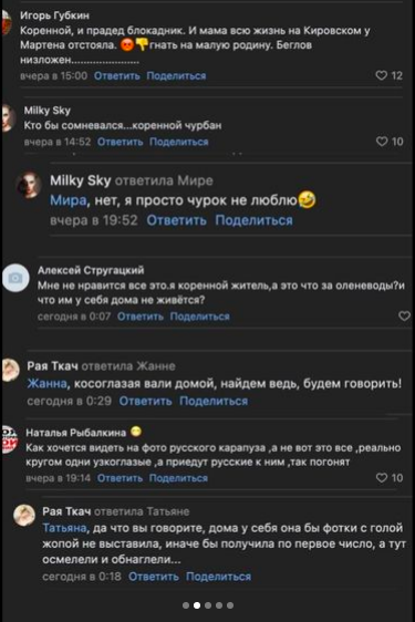 Впоследствии пользователи «ВКонтакте» начали массово оставлять комментарии, в которых они называли Венеру «косоглазой», «оленеводом». Также жители Петербурга обвинили тувинку в «замещении славян».