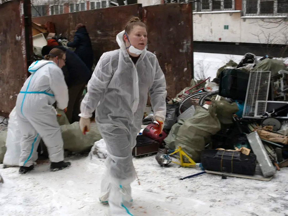 Несколько мужчин и женщин в белых комбинезонах выносят вещи и спорят с дворниками в оранжевых жилетах: «Нам не хватает машины, чтобы вывезти! Закажите еще!»