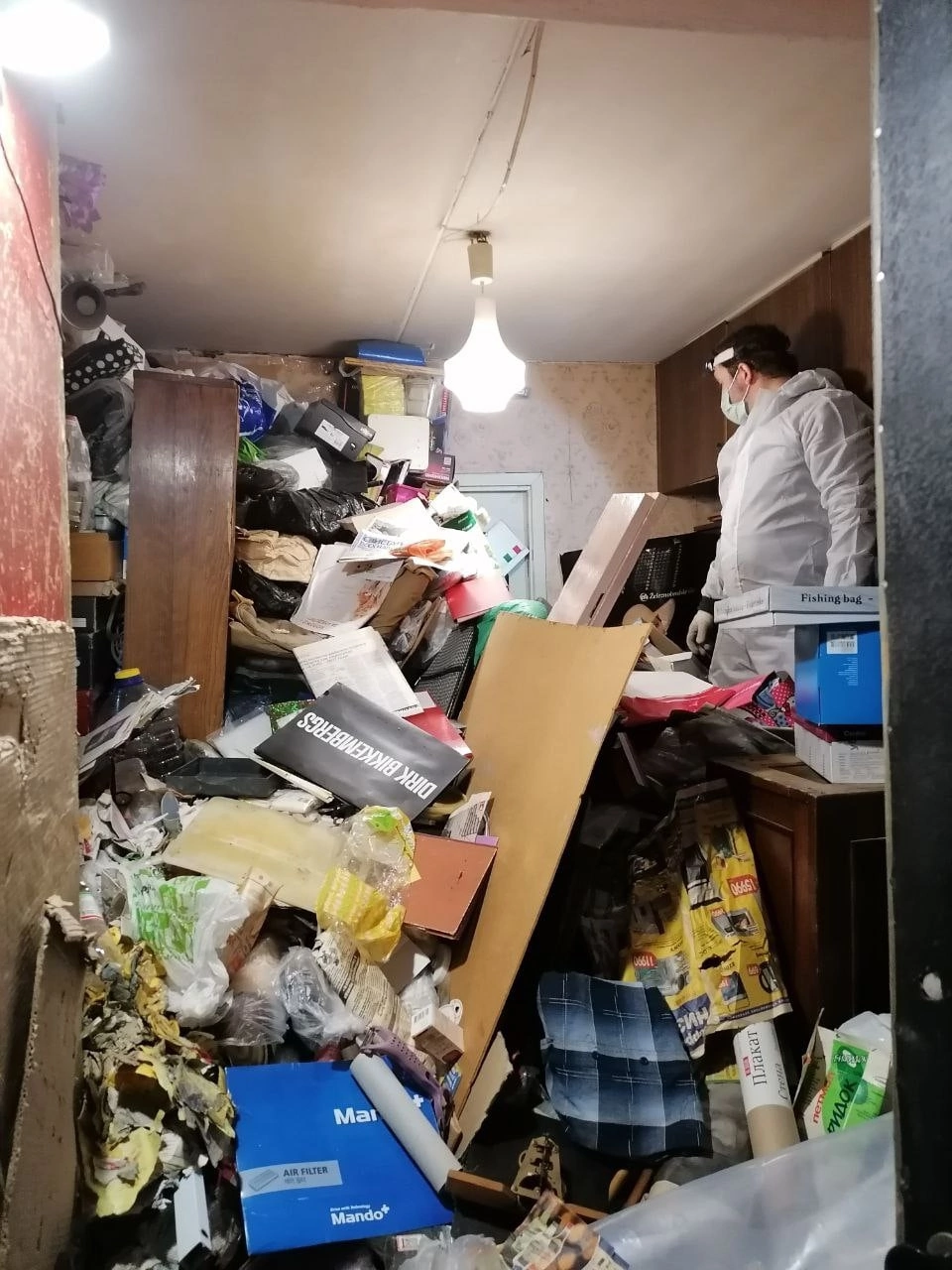 Когда лифт поднялся на верхний этаж, мужчина достал ключ от квартиры и открыл дверь. За ней была стена хлама.