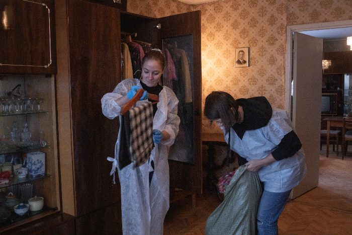 Разбирать вещи приехали несколько волонтеров.