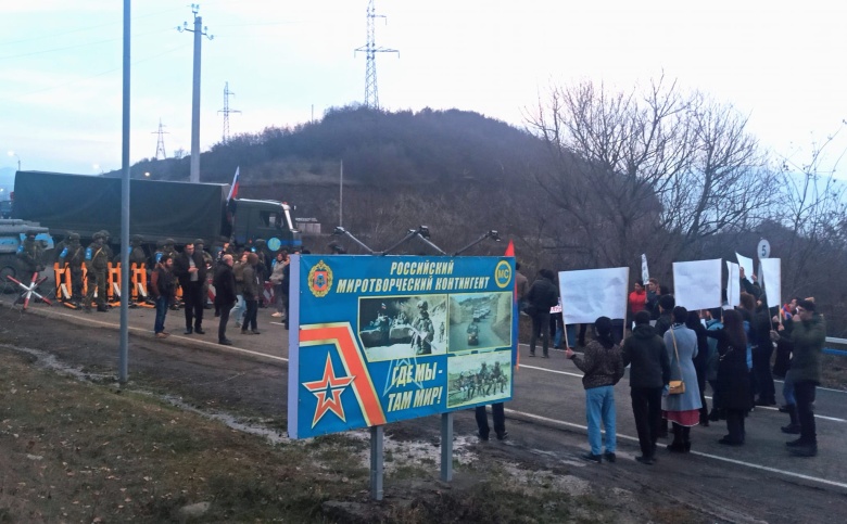 Манифестанты перед базой российских миротворцев в Нагорном Карабахе