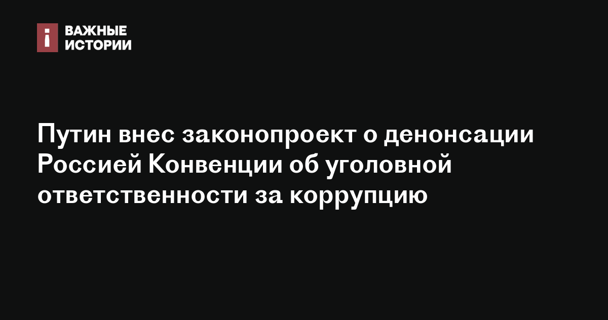 Владимир Путин внес в Госдуму законопроект о денонсации Международной конвенции об уголовной ответственности за коррупцию.