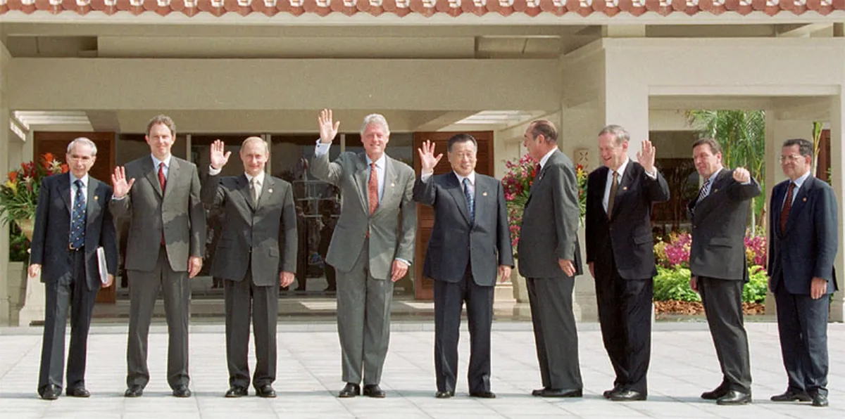 Первый в XXI веке саммит «Большой восьмерки» проходил в 2000 году на японском острове Окинава. Молодой президент России Владимир Путин впервые участвовал во встрече такого формата. На общей фотографии глав государств и правительств улыбающийся Путин стоит между премьер-министром Великобритании Тони Блэром и президентом США Биллом Клинтоном. На той же фотографии — лидеры Канады, Франции, Германии, Италии, Японии и Европейского союза. Они дурачатся: одни смотрят в камеру прямо, другие — повернулись к ней боком. Кажется, будто в тот день в Окинаве собрались не главные лидеры мира, а однокурсники на день встречи выпускников.