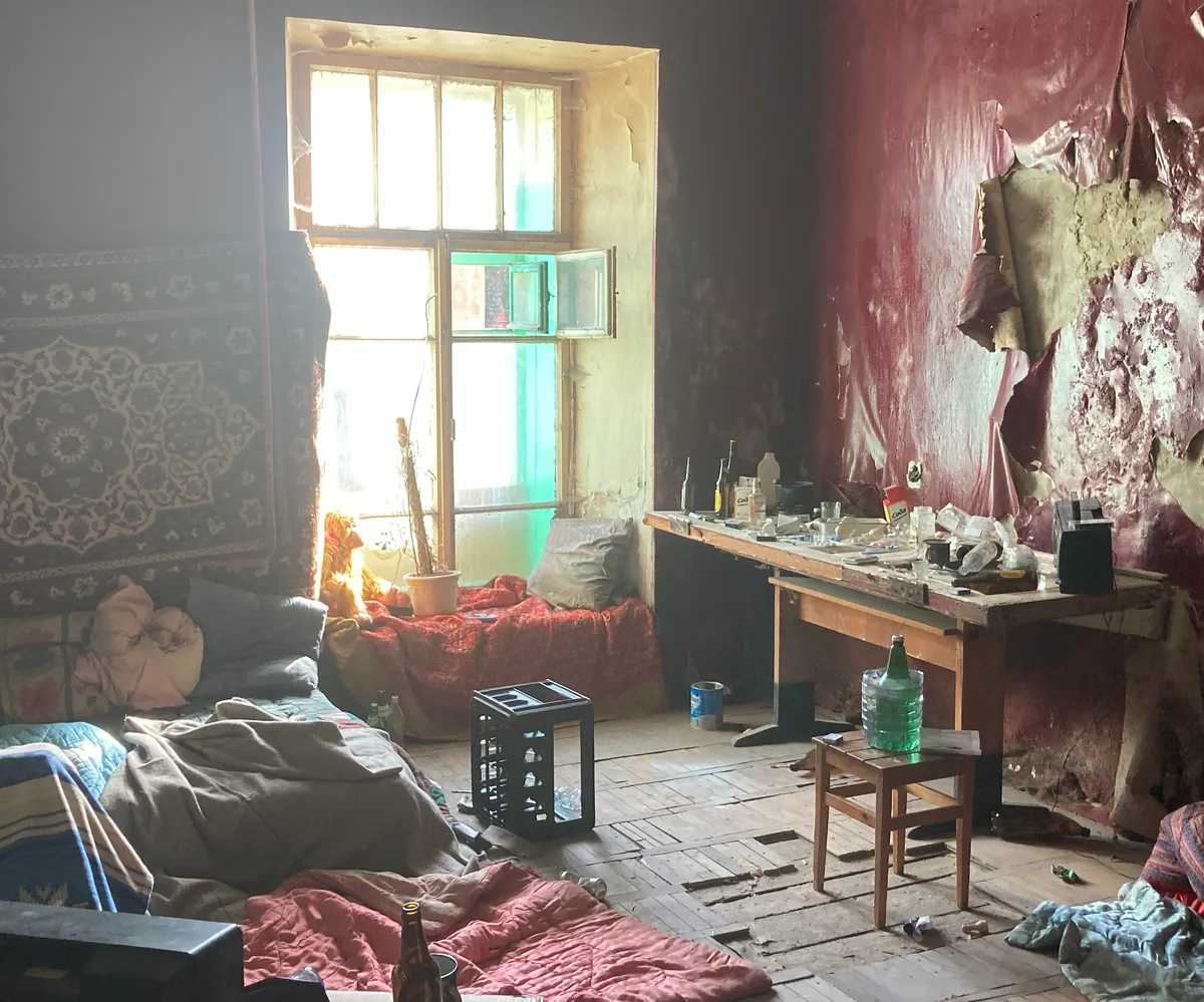 А на «Миттельмарше» в самом начале все было продумано. История первой любви, взаимосвязи поколений на фоне митингов и борьбы за охрану памятников. Придумали старинную оранжерею, выбирали квартиры. Оказалось, что денег на строительство нет. Нужно было срочно менять концепцию. Я предложил погрузить город в ремонтные работы. Выбирали дома в лесах, сетках, баннерах — у нас же вечно плитку меняют и все перерыто. Герой смотрит в окно, а там ноги чьи-то ходят по лесам. Оранжерею нашли в Сестрорецке. От старой фабрики лишь остов остался. Полиэтиленом и сетками все затянули, они колыхались на сквозняке, мрачно оживляя пространство. Хотелось эту заброшенность, разруху довести до абсурда, сохранив верность теме.