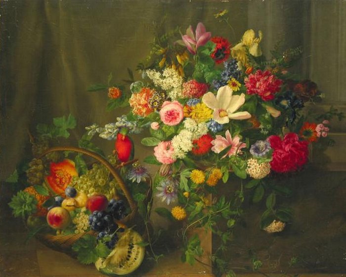 На картине Леопольда Штоля «Плоды и цветы» изображен страстоцвет голубой. Он повернут к зрителю так, чтобы были отчетливо видны все части цветка. Страстоцвет отсылает к смыслу, который вкладывали в него иезуиты.