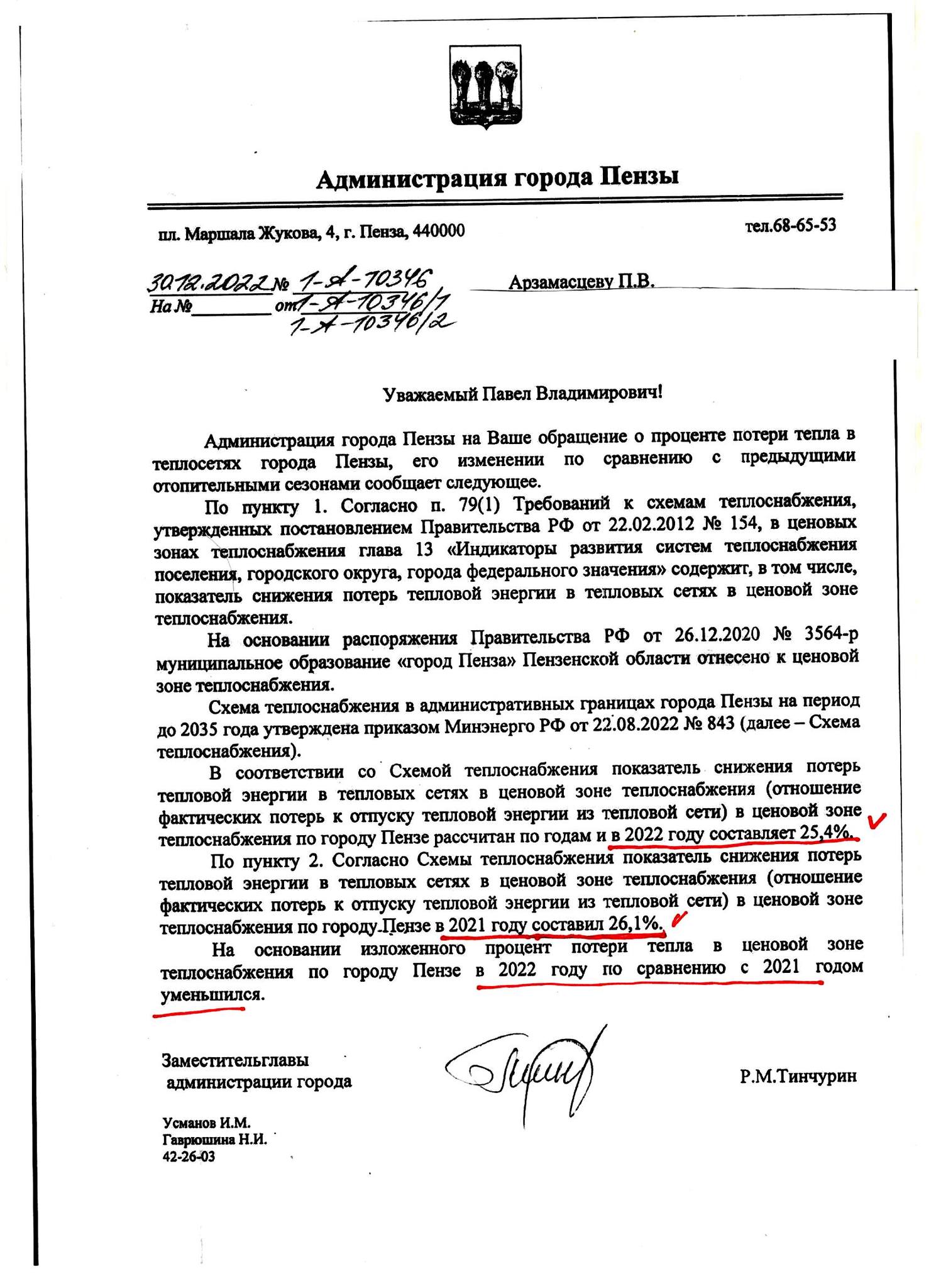 Как следует из письма заместителя главы г. Пензы по коммуналке Тинчурина Р.М., тепловые потери в теплосетях города в 2021 году составили 26,1 %, а в 2022 г. – 25,4 %, то есть, уменьшились на 0,7 %.