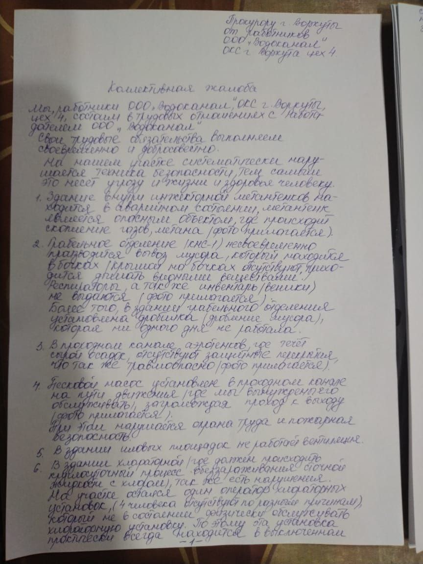 Еще до аварии на очистных сооружениях стоки были далеки от санитарных норм. 11 ноября 2022 года сотрудники станции написали коллективное обращение прокурору Воркуты (есть в распоряжении Север.Реалии). В ней среди жалоб на аварийное состояние объектов и несоблюдение техники безопасности они указали на отсутствие полноценной очистки сточных вод.