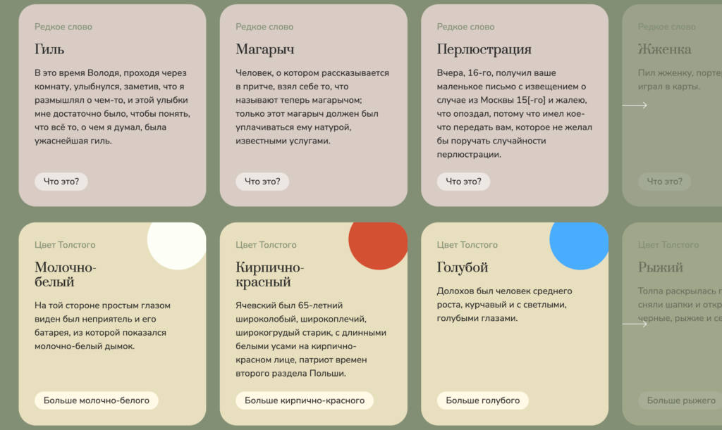 Редкие и устаревшие слова, возникающие в текстах Толстого, отмечены в корпусе зеленым цветом и кликабельны. В словаре редких слов можно найти их значения, примеры употребления и классификацию, составленную лексикографом Ксенией Костомаровой. Например, ботвинья означает холодное блюдо из кваса, вареной зелени и рыбы и встречается на столе у Вронского во время званого обеда. А свайка — народная игра, за которой Пьер Безухов наблюдает на Бородино: офицеры кидали большой толстый гвоздь в лежащее на земле кольцо. Необычные цвета для Толстого тоже не редкость: от разномастных лошадей — игреневой (рыжей со светлой гривой) в «Войне и мире» и мухортого (гнедой с желтоватыми подпалинами) в «Хозяине и работнике» — до прюнелевых (черных с синим отливом) ботинок и башмачков. «Жасминная помада прекрасная вещь и прюнелевые ботинки тоже, и зонтик тоже, но нейдут как-то они к моим понятиям о Кавказе» — находим мы в неоконченном очерке «Поездка в Мамакай-Юрт».