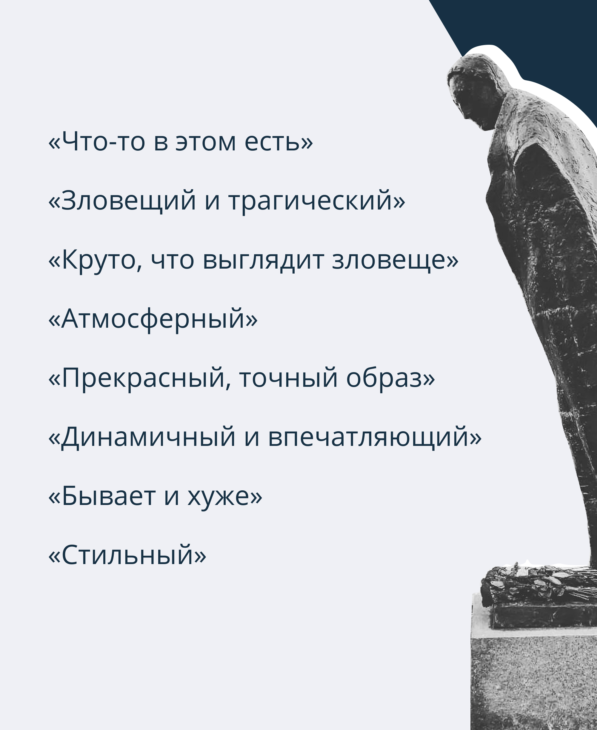 Исполнение вызвало у петербуржцев полярную реакцию. Горожане как критикуют задумку с наклоном, пропорции скульптуры и несоответствие образу поэта, так и видят в памятнике динамику, трагизм и «зловещесть». «Бумага» изучила комментарии в соцсетях и показывает, как разделились мнения.
