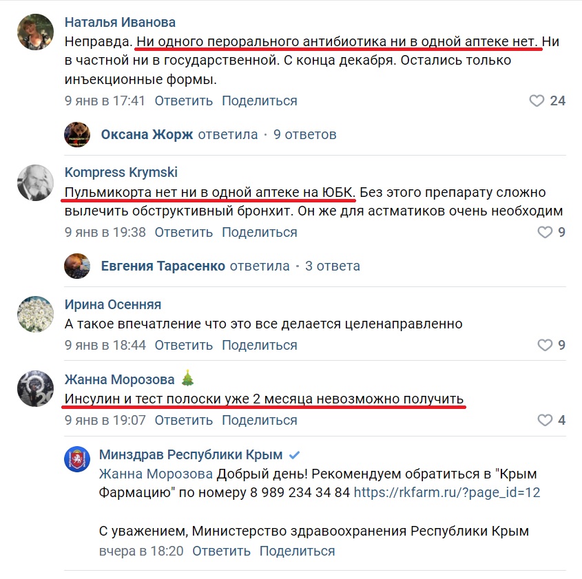 После этого заявления крымчане оставили на странице Минздрава Крыма в соцсети «Вконтакте» десятки сообщений о том, что и после 9 января в аптеках отсутствуют разные медицинские препараты. Представители ведомства в ответ рекомендуют им обращаться в «Крымфармацию» – предприятие, через которое закупают лекарства для полуострова.