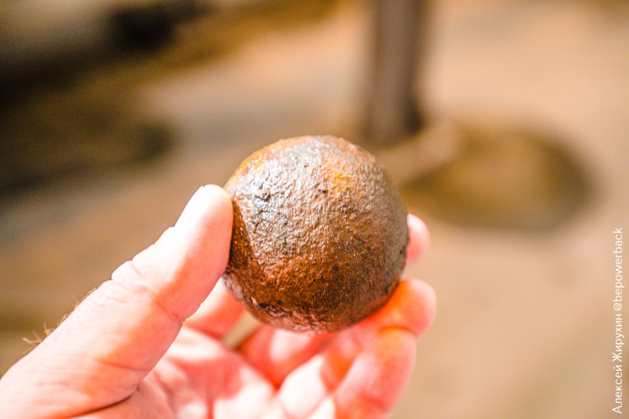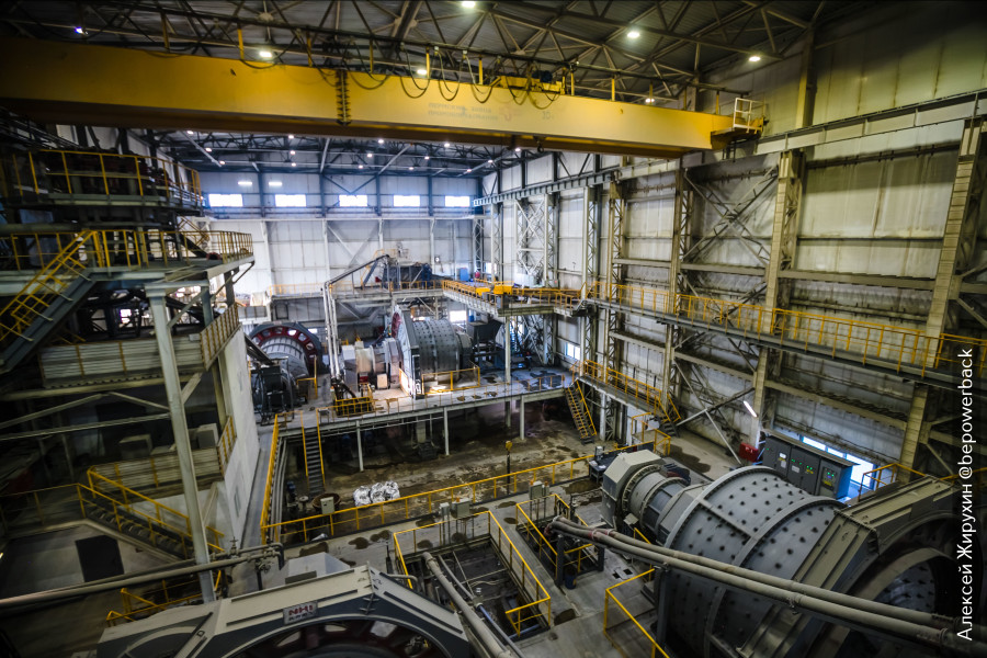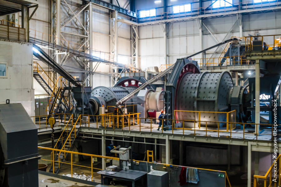 На ЗИФе дробленая руда поступает в мельницы мокрого полусамоизмельчения, в которых используются металлические шары диаметром 100 мм.