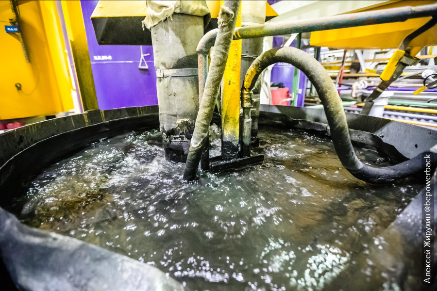 Затем уголь обрабатывается в специальных емкостях с применением температуры и атмосферного давления. Золото с угля переходит в раствор, который называется товарным регенератом.