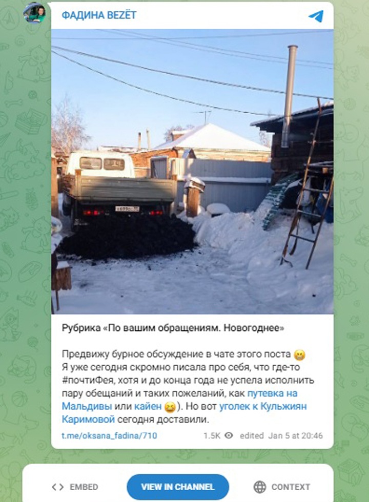 Омский депутат Госдумы от «Единой России», бывшая мэр Омска Оксана Фадина отчиталась о подвозе угля для местной жительницы.