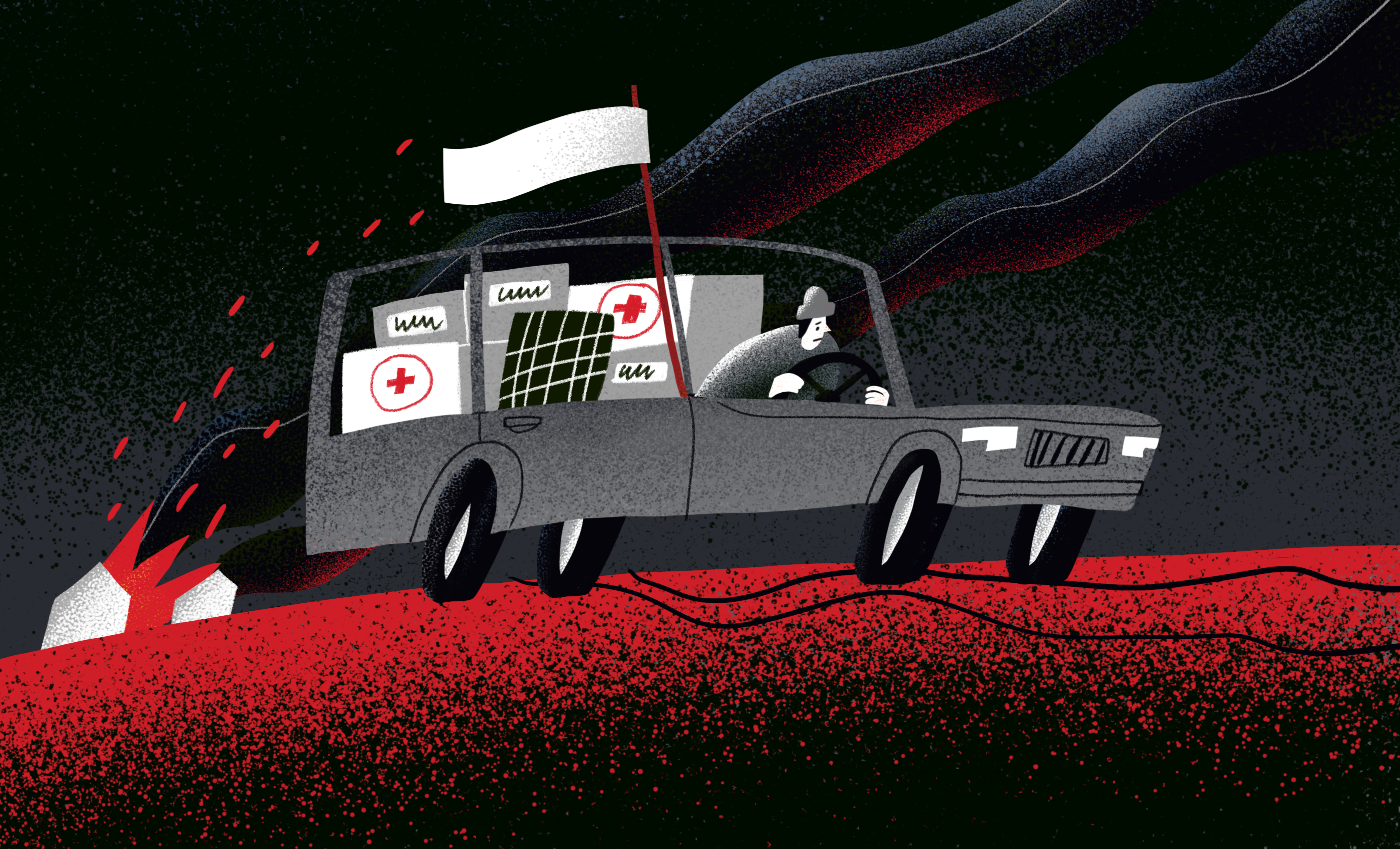 Стемнело и становилось все холоднее. Внедорожник тужился, колеса скользили, пока мы пытались вытолкать из грязи прицеп. Чтобы уменьшить вес, мы выгрузили из него генератор, сотни батонов хлеба, бутылки с моющим средством, рулоны туалетной бумаги, упаковки тампонов и пачки мыла. И тут послышался низкий рев. На вершине холма появился одинокий украинский БМП — непосвященные часто путают эти машины с танками из-за гусениц и пушки. БМП резко остановился. В отсвете тормозных огней мы увидели, как из люка начали вылезать солдаты. Какого черта вы тут делаете? Нет, у нас приказ, мы не можем помочь вам вытянуть прицеп. Да, Варваровка в той стороне, но добраться туда сегодня шансов никаких. Развернитесь и попробуйте найти ночлег рядом с Васильевкой. И с этими словами они исчезли в дыму выхлопных газов.