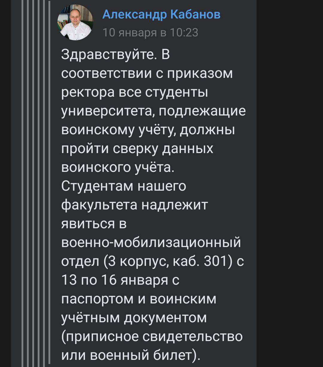 Отказавшихся ждет выговор или даже отчисление, написал Александр Кабанов в мессенджерах студентам. Студенты, опрошенные редакцией, сообщили, что не собираются идти в военкомат, несмотря на угрозы.