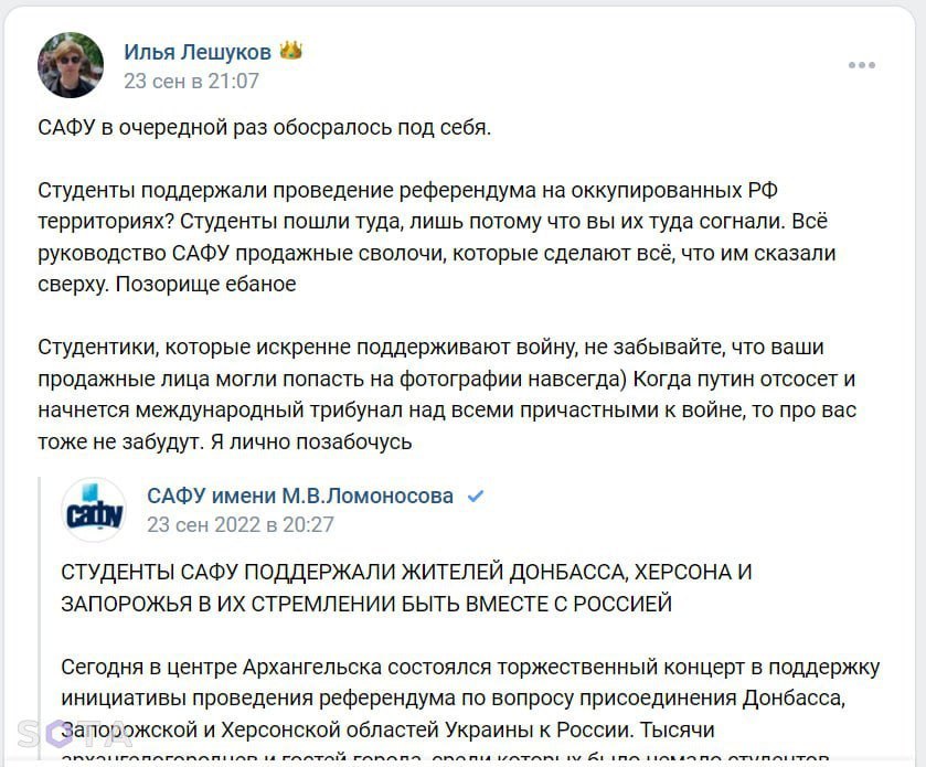Это вполне в духе вуза, считает Илья Лешуков. Руководство САФУ, по его словам, восхваляет Путина и поддерживает войну. Самому Лешукову вуз отказал в академическом отпуске весной 2022 года после того, как он уехал из России. После этого Лешуков решил отчислиться — но руководство САФУ оформило приказ, по его словам, «задним числом». Это закрыло ему возможность восстановиться на бюджетную форму обучения.