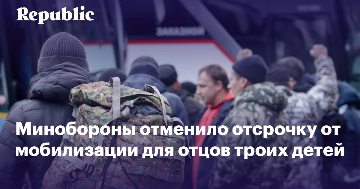 Глава комитета Госдумы по вопросам семьи, женщин и детей Нина Останина сообщила об отмене Генштабом Минобороны РФ пункта об отсрочке от мобилизации для отцов из семей с тремя несовершеннолетними детьми. Останина ссылается на члена Совета по правам человека Ирину Киркору, которая знает о соответствующем документе, направленном в военкоматы в декабре, а также на источник в Генштабе.