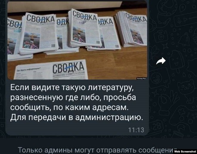 "Если видите такую литературу, разнесенную где либо, просьба сообщить, по каким адресам. Для передачи в администрацию", - говорится в сообщении, проиллюстрированном фотографией из новости Кавказ.Реалии.