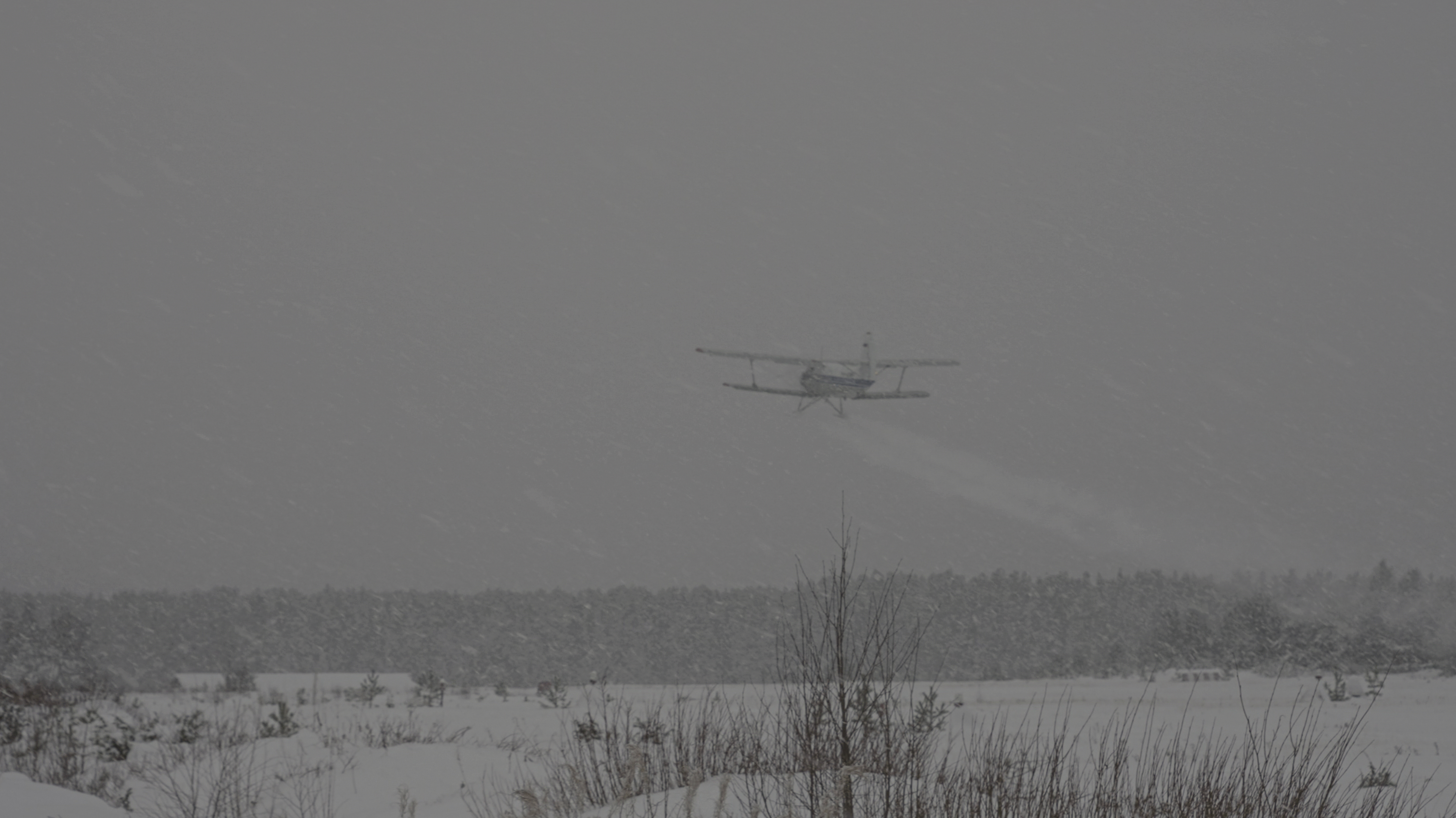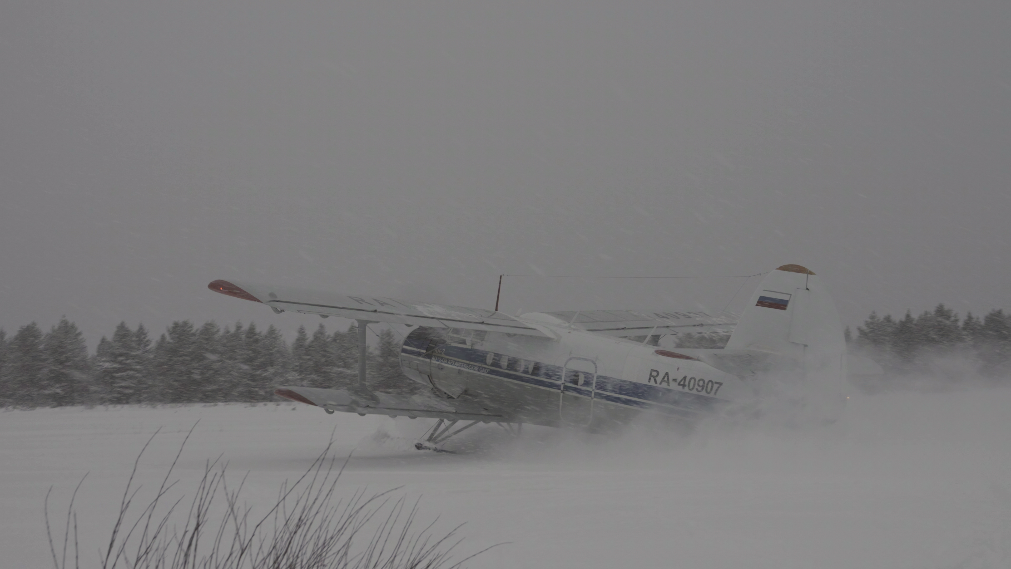 Снег перестает, припорошенная взлетка светится под тусклым небом, затянутым облаками.