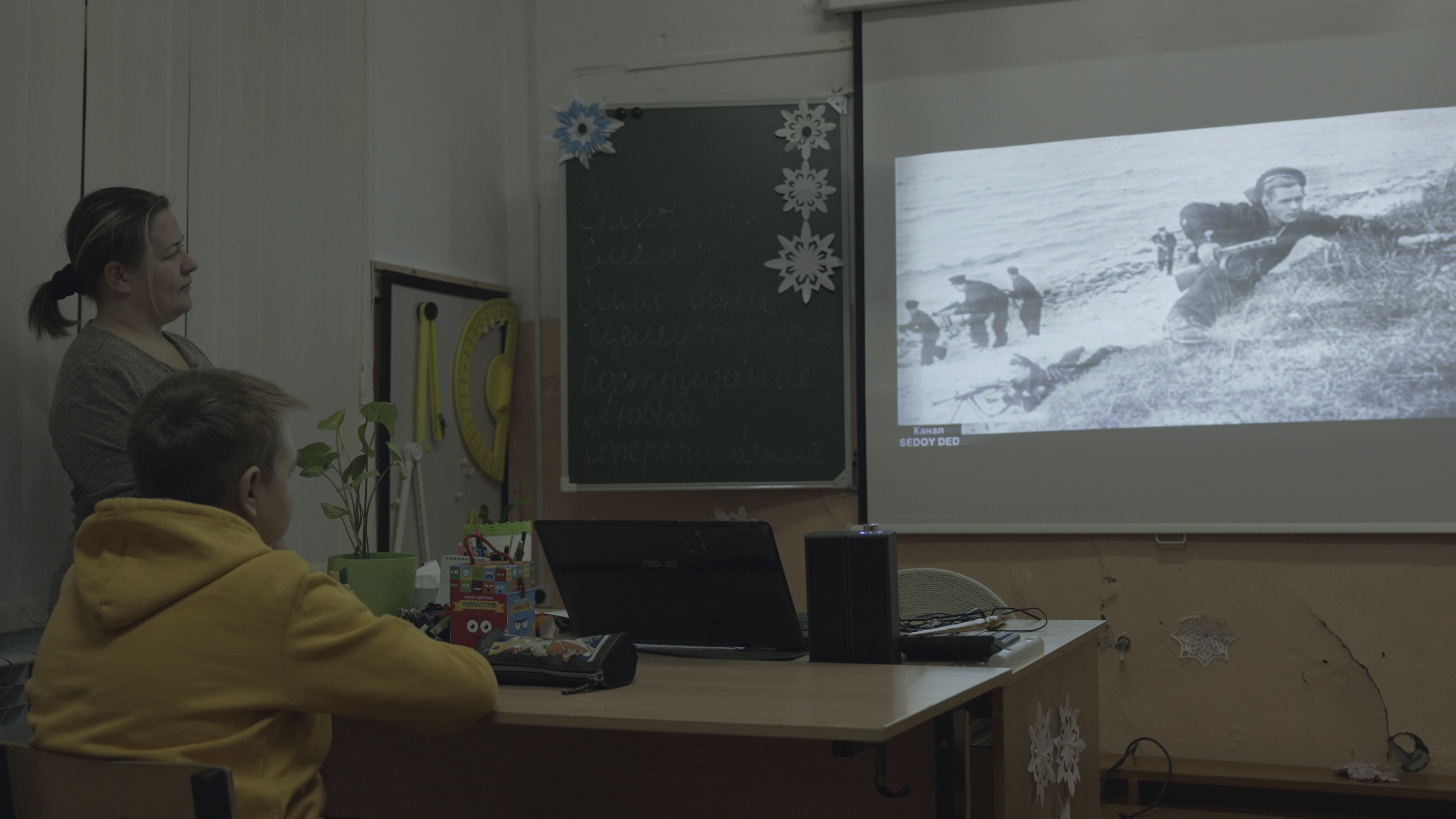 Утро понедельника. У входа в просторную, оставшуюся с прежних времен школу послушно ждут собаки. В зале для прогулок – портрет Путина и российский флаг, в сенях – туалеты модели "дырка в полу". На сайте школы – приглашения участвовать в акции "Обнимайте детей" и в федеральном проекте "Все для победы!" по поддержке бойцов и мирных жителей, пострадавших от военных действий Украины. Учеников чуть больше десятка.