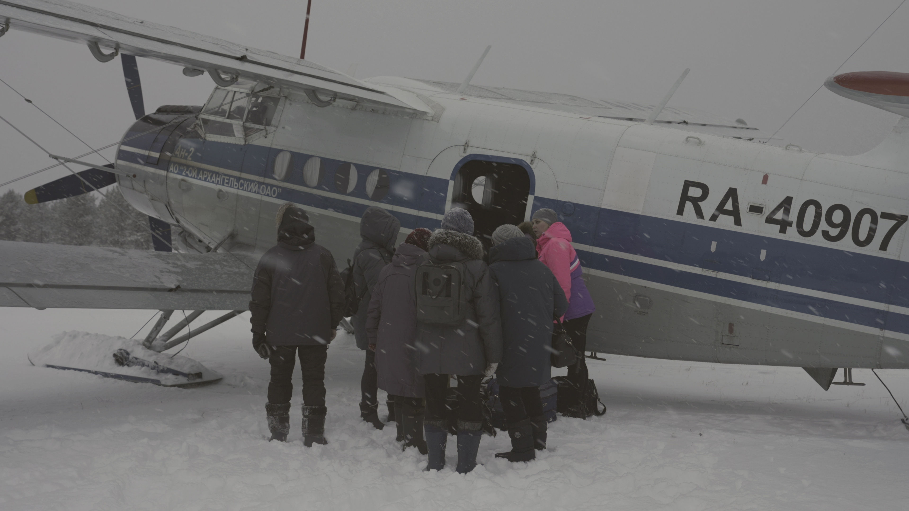 Крошечный биплан касается лыжами взлетки – и почти скрывается в снежном вихре. Он еще не остановился, а к полю уже спешат снегоходы. На подпрыгивающих санях сидят три бабульки и собака. Кто-то бежит, увязая в хрустящем снегу. Сонная деревня, еще недавно казавшаяся вымершей, оживает. Лай, смех, приветствия, скрип полозьев, шорох выгружаемых ящиков. На больших картонных коробках белеет надпись "Новогодние подарки".