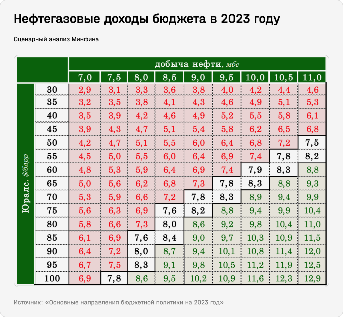 Но эти бюджетные планы сверстаны исходя из средней цены на нефть $70,2 за баррель Urals. Как изменятся нефтегазовые доходы при других ценах и уровнях добычи, можно посмотреть в одном из основных бюджетных документов — «Основных направлениях бюджетной политики на 2023 год».