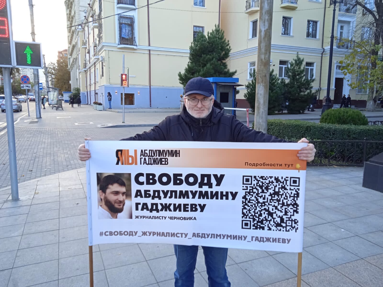Одиночные акции, инициированные редакцией “Черновика” в поддержку журналиста Гаджиева, проходят в Махачкале каждый понедельник на протяжении более трех лет.