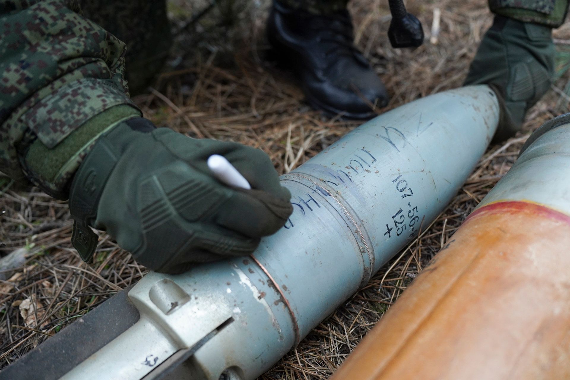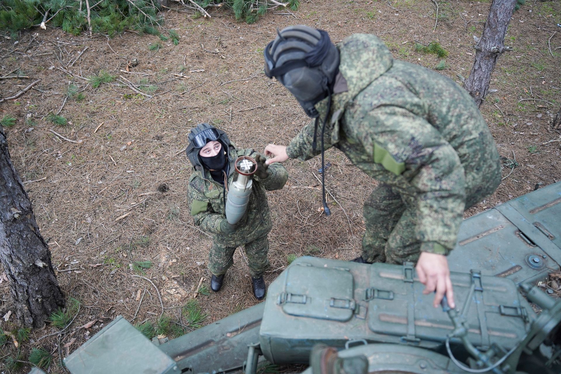 Андрей Рубцов / ТАСС Российский танкист в оккупированной Херсонской области пишет послание на снаряде