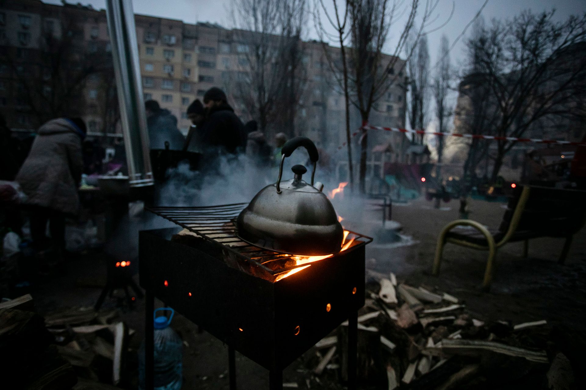 Yevhenii Zavhorodnii / Global Images Ukraine / Getty Images Жители дома на набережной Победы в Днепре, два подъезда которого были уничтожены попаданием ракеты, кипятят воду на мангале