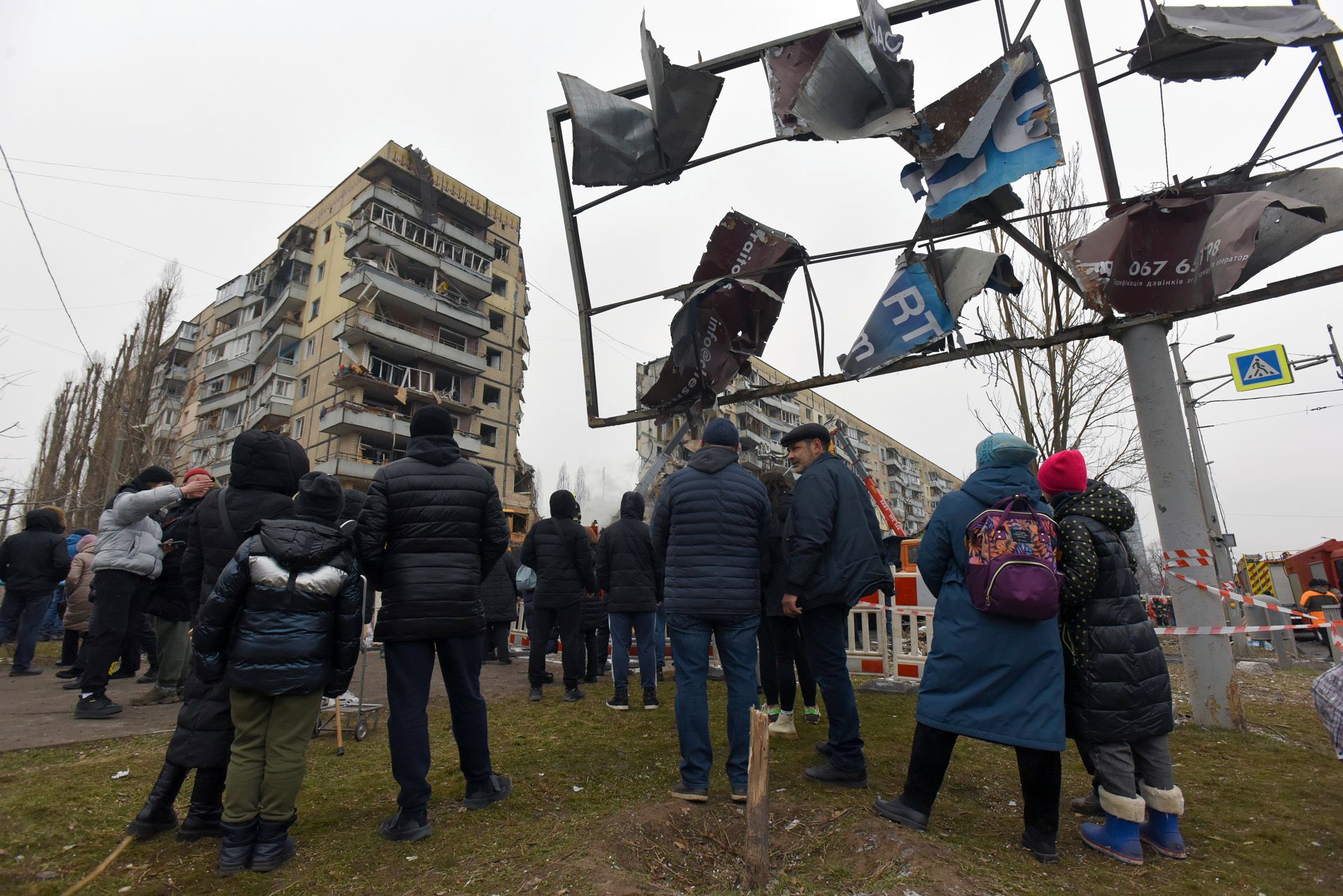 Oleg Petrasyuk / EPA / Scanpix / LETA Жители дома на набережной Победы смотрят на свой разрушенный ракетой дом