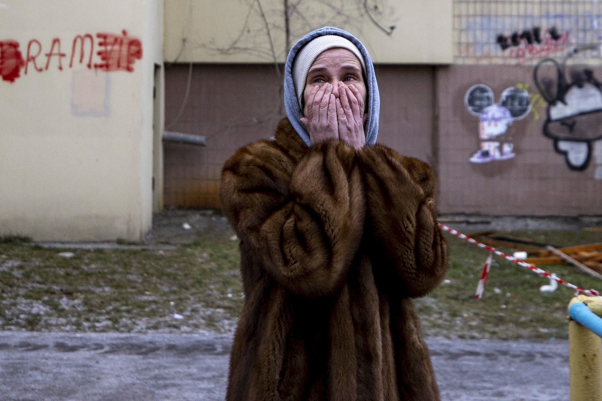 Mustafa Ciftci / Anadolu Agency. / ABACAPRESS / ddp images / Vida Press Жительница дома на набережной Победы в Днепре наблюдает за работой спасателей, расчищающих обломки дома
