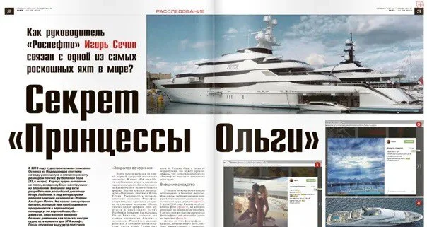 В своей статье«Секрет «Принцессы Ольги» Анин рассказывал, как руководитель «Роснефти» Игорь Сечин мог быть связан с одной из самых дорогих яхт в мире. После публикации иск сначала подала супруга (на тот момент) Ольга Сечина, а затем сам глава госкорпорации. Впрочем, что-то пошло не так — не договорились в семье. Супруга настаивала, что это вмешательство в частную жизнь и публикация персональных данных (тем самым признавая достоверность фактов, изложенных в расследовании «Новой»), а глава «Роснефти» утверждал, что все — ложь и пострадала его деловая репутация.