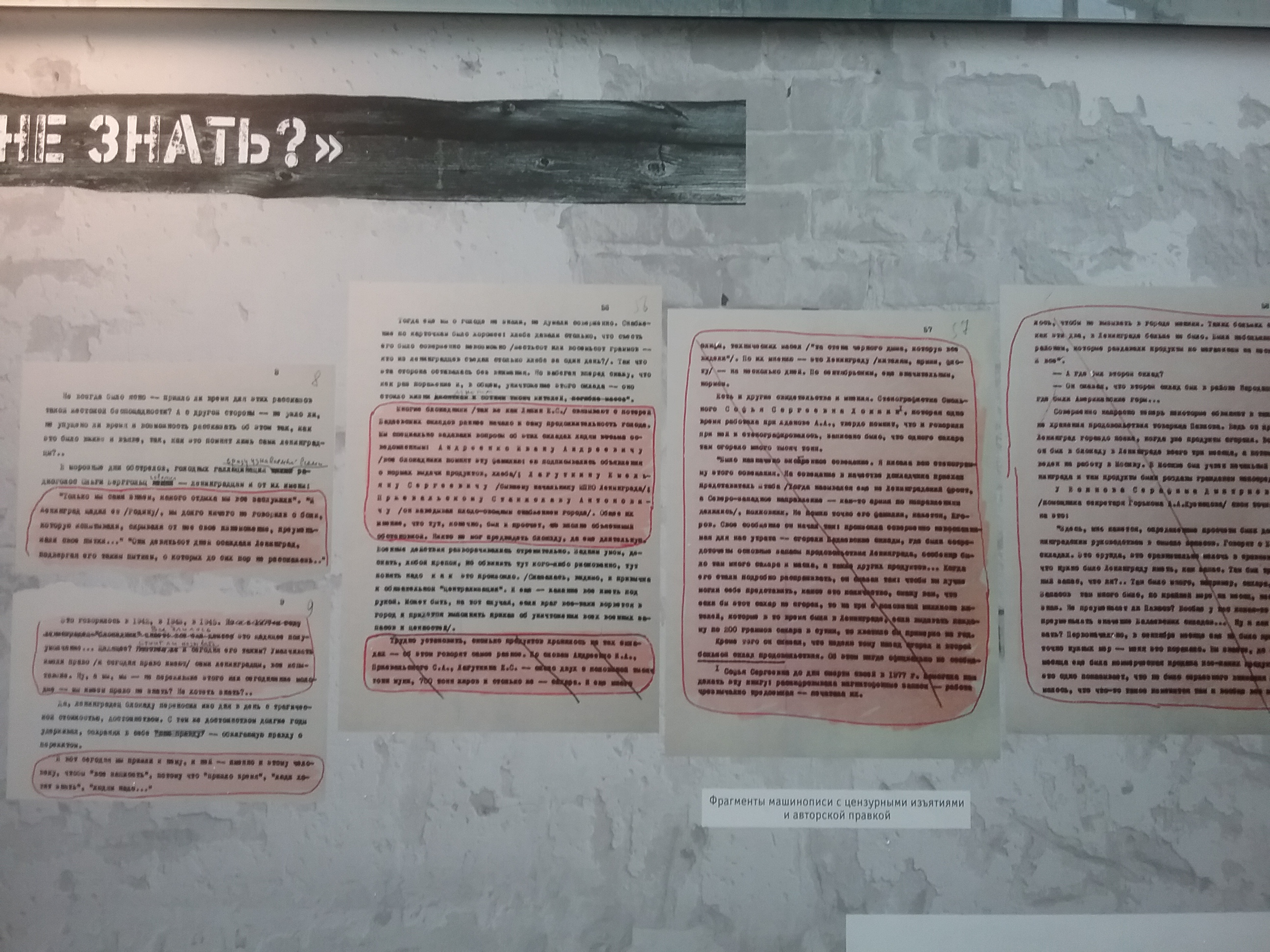 “Блокадная книга” создавалась в 1970-е годы, первая часть, жестко исковерканная цензурой, вышла в 1979 году в издательстве "Советский писатель" ничтожно малым по тогдашним меркам тиражом 30 тысяч экземпляров. Возможно, цензурная история книги – наиболее интересная часть выставки: страницы машинописи, где вымарана треть, половина, а то и большая часть текста.