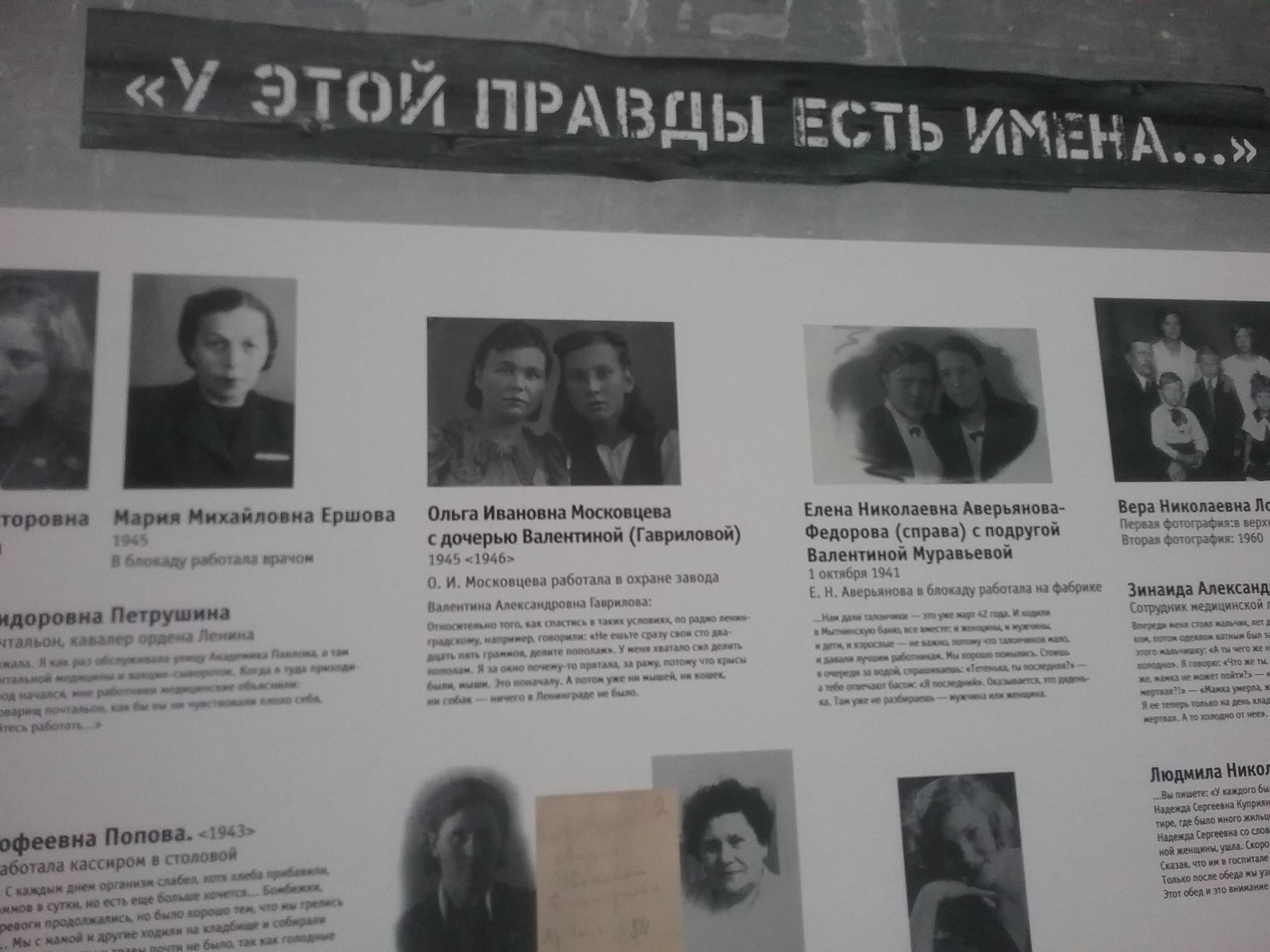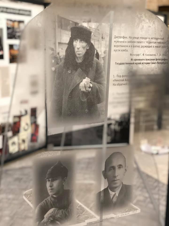Выставка приоткрывает правду, возвращая имена блокадным теням. Все знают трагическую фотографию дистрофика в ушанке, с куском хлеба – так вот, безымянная фотография обрела имя: Николай Алексеевич Панов, и рядом еще две его фотографии – 20-х годов и послевоенного времени, из архива Алеся Адамовича. После войны этот человек выглядит гораздо моложе, а на блокадном снимке он – старик.
