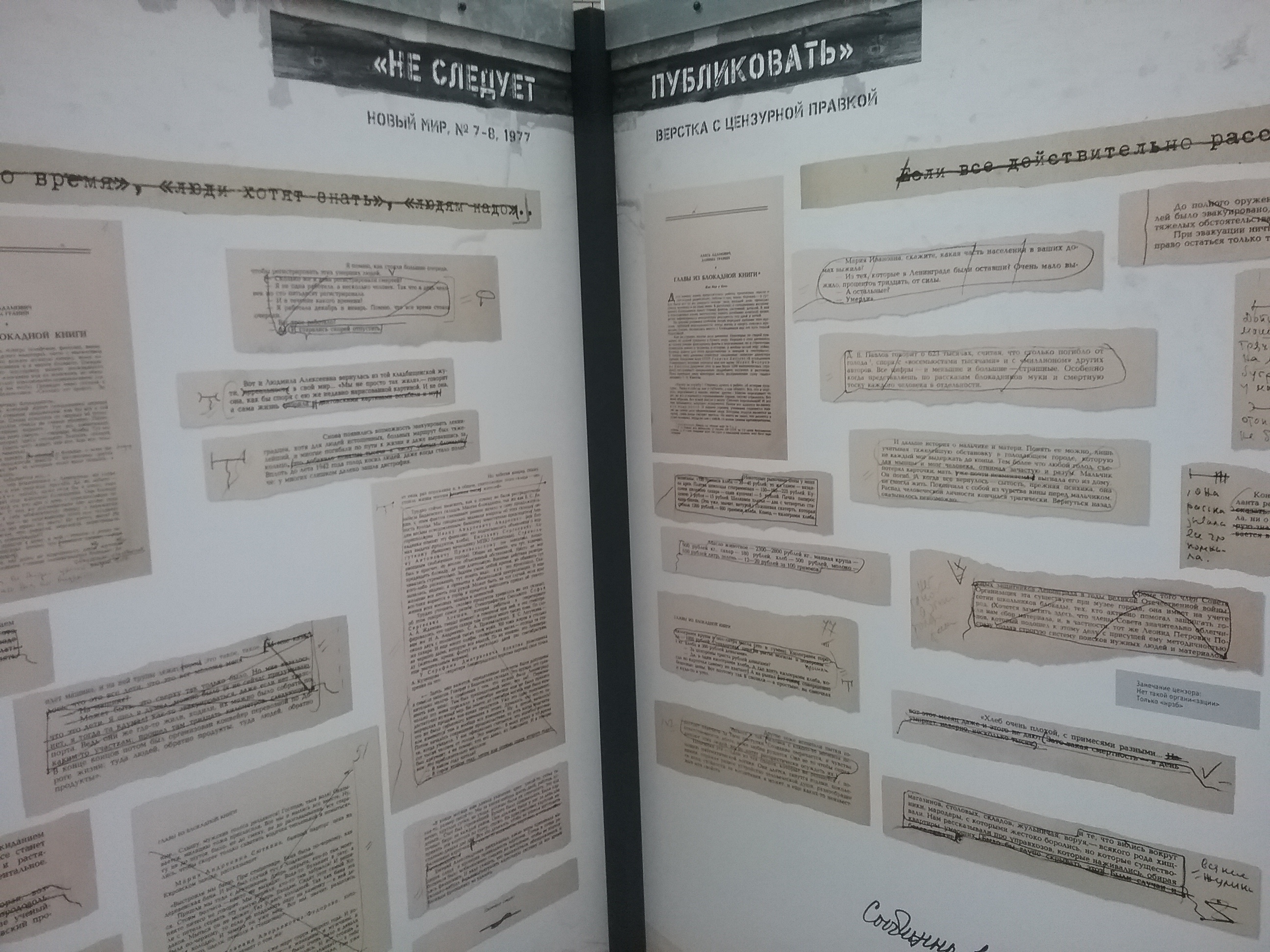 Даже в дневнике умирающего мальчика Юры Рябинкина многое показалось вредным для советских людей. Вычеркивался и авторский текст, например, слова о том, что "пришло время", "люди хотят знать", и даже о том, что правду о блокаде еще предстоит написать историкам будущего: а вдруг это поймут так, что история блокады советскими историками освещена недостаточно. На выставке впервые показаны секретные документы, остановившие журнальную публикацию книги.