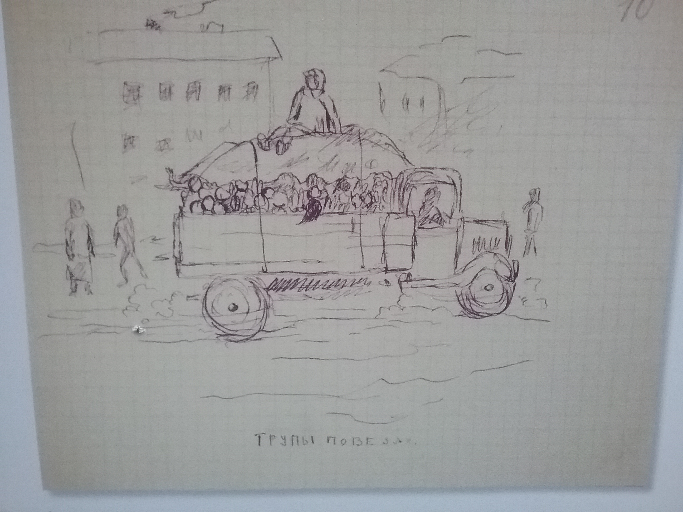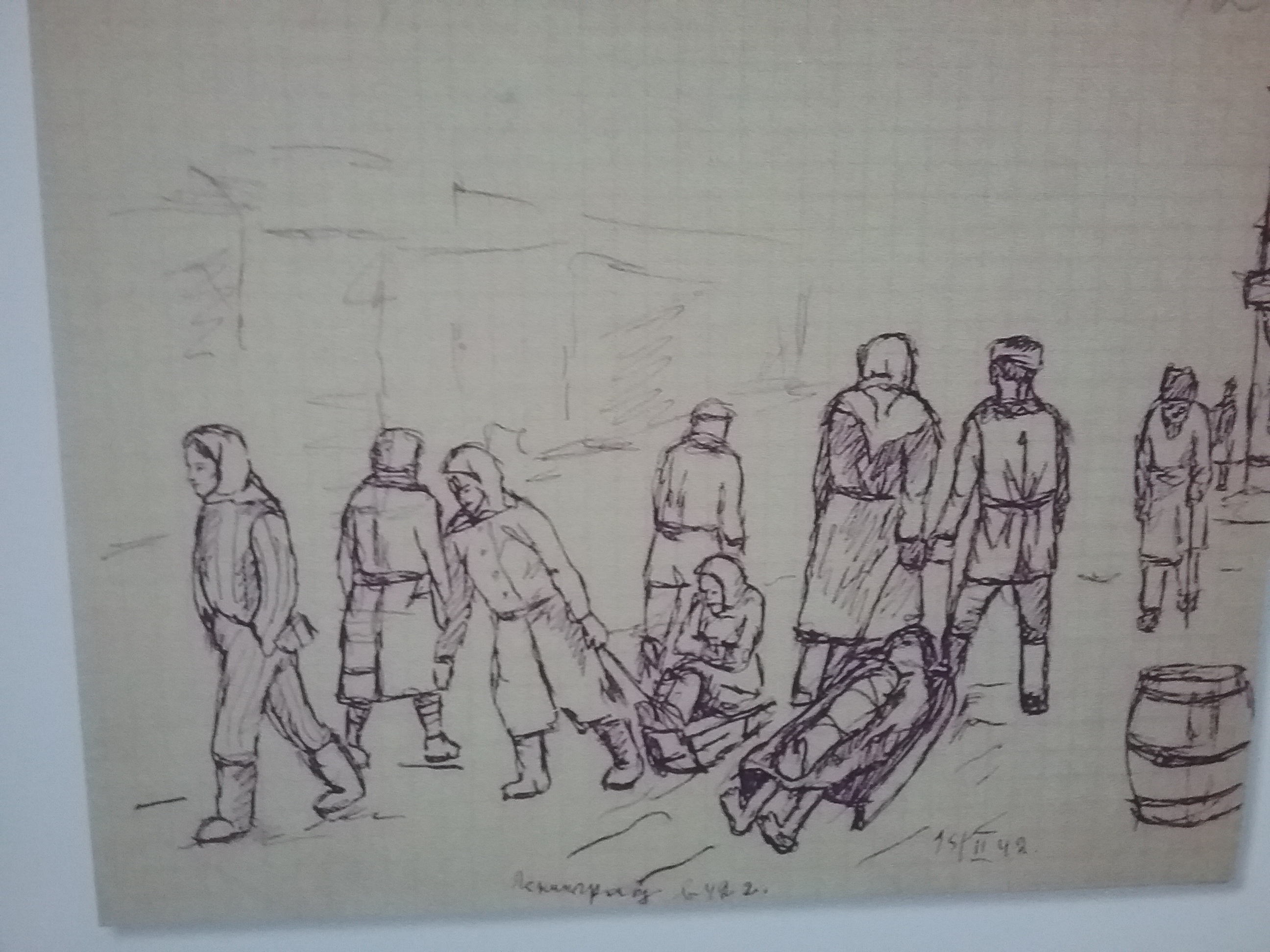 Стенд "Саперный переулок в детских рисунках" – это просто повседневная жизнь: вот везут на санках обессилевшего мужчину, а навстречу едут другие санки, с мертвецом.