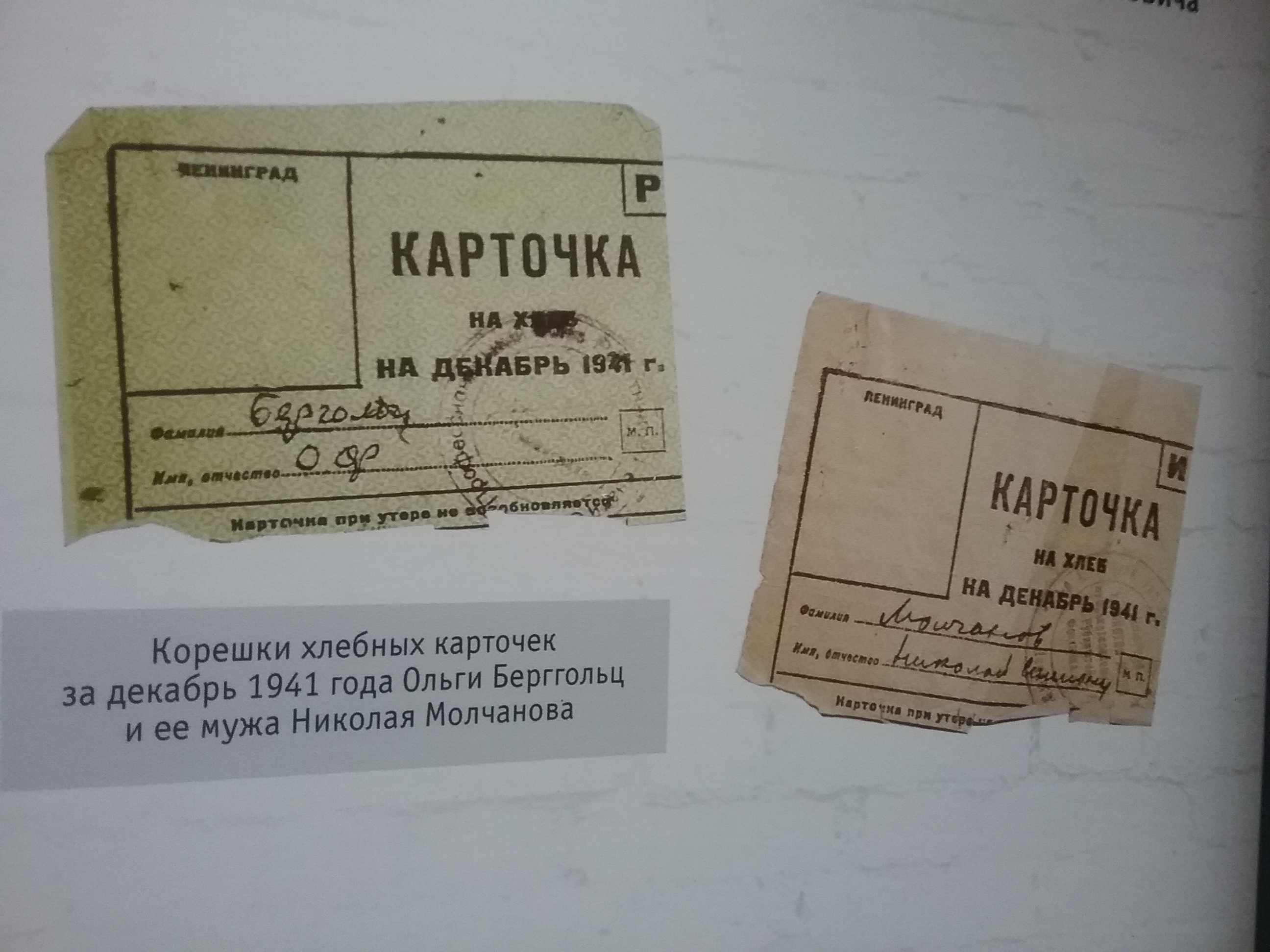 На другом стенде – хлебные карточки за декабрь Ольги Берггольц и ее мужа Николая Молчанова – рабочая и иждивенческая. Рядом – написанные четким красивым почерком письма Зои Васильевны Блюхер, дочери расстрелянного маршала Блюхера. Она пишет, что не могла и подумать, что правда о блокаде когда-нибудь будет рассказана. И множество других писем читателей, благодарящих за "Блокадную книгу", как за возвращенную жизнь.