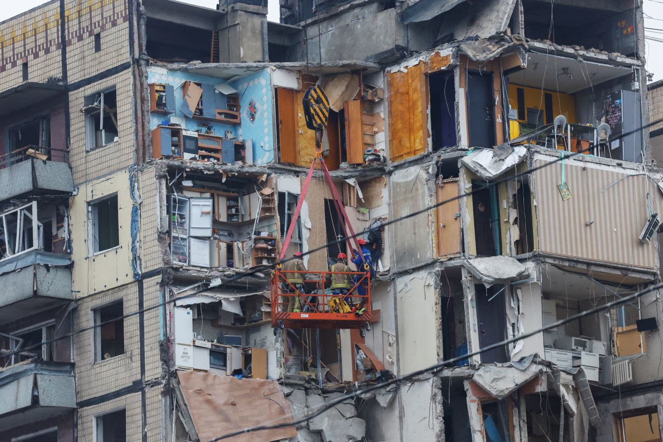 Clodagh Kilcoyne / Reuters / Scanpix / LETA Поисково-спасательные работы на месте взрыва жилого дома в Днепре, 16 января 2023 года