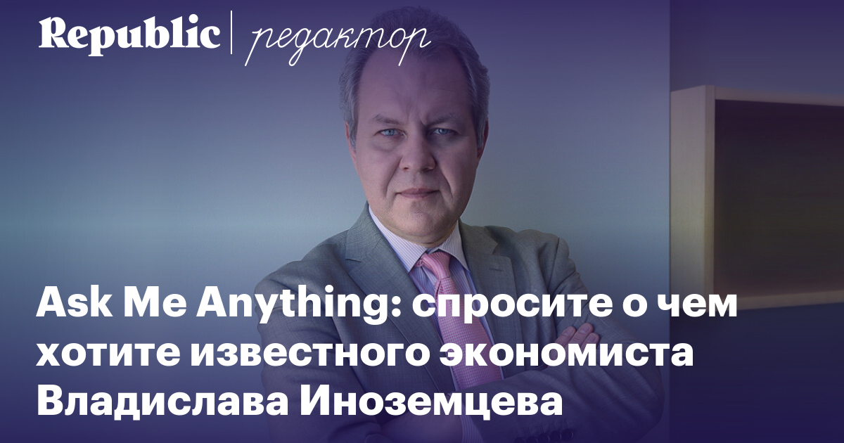 Republic предлагает своим подписчикам попробовать новый формат общения с интересными спикерами: сессию Ask Me Anything (AMA, «Спроси меня о чем угодно»). Первым гостем станет известный публицист, доктор экономических наук, постоянный автор Republic Владислав Иноземцев.