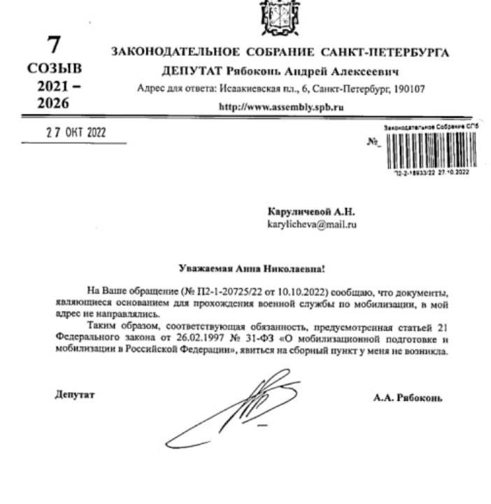 41-летний депутат Андрей Рябоконь ("Единая Россия") ответил, что в его адрес не приходили документы, "являющиеся основанием для прохождения военной службы по мобилизации" (имеется в виду повестка или мобилизационное предписание. – СР) и поэтому "обязанность явиться на сборный пункт не возникла".