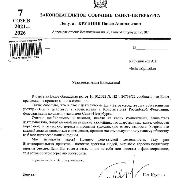 49-летний депутат Павел Крупник – глава фракции "Единая Россия" в Законодательном собрании – заявил, что "в своей деятельности депутат руководствуется собственными убеждениями и действует в соответствии с Конституцией Российской Федерации, федеральными законами и законами Санкт-Петербурга". "Уверен, что каждый должен заниматься своим делом, принося максимальную пользу нашему обществу во благо интересов нашей Родины... Моя передовая здесь! Помимо депутатской деятельности, я веду ряд благотворительных проектов, помогаю десяткам людей, оказываю адресно поддержку многим семьям. Если вы готовы взять на себя мои проекты и финансирование, то я готов об этом серьезно поговорить", – написал Крупник, который по возрасту еще подлежит призыву по мобилизации.