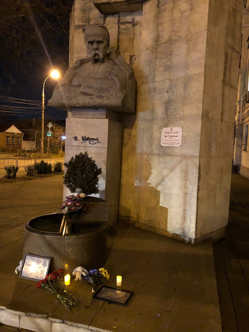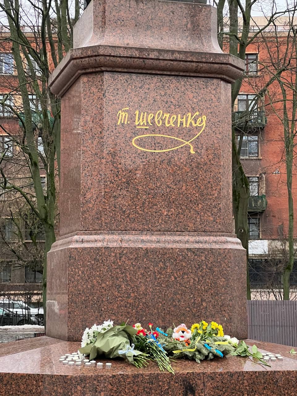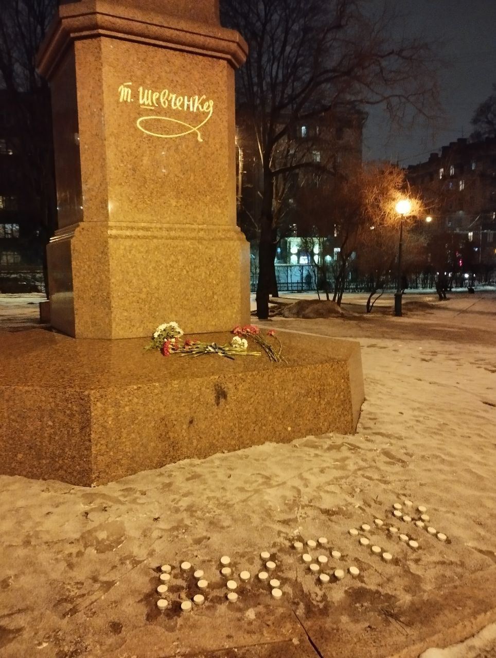 Жители Санкт-Петербурга приносят цветы к памятнику Тарасу Шевченко на площади его имени. Зажженными свечами они выложили перед памятником слово "Днепр" в память о погибших украинцах. Цветы приносят также на Днепропетровскую улицу в центре города.
