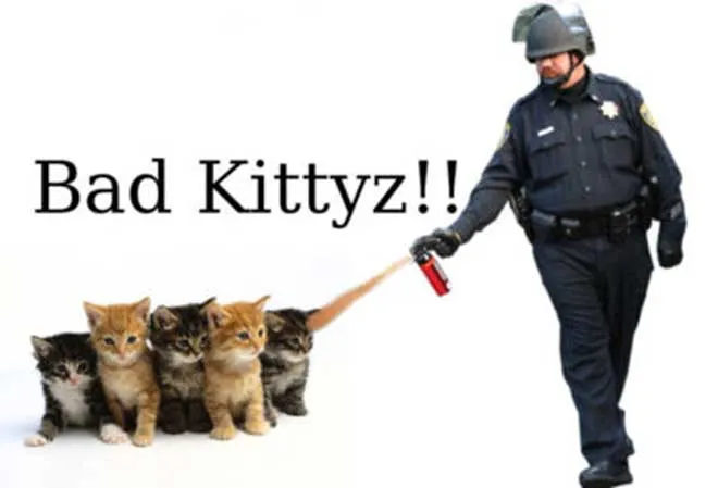 — Например, в контексте движения Occupy Wall Street в 2011 году: видео полицейского, равнодушно заливающего протестующих из перцового баллончика, разлетелось на мемы («casually pepper spraying cop»). Перенесение полицейского в другие контексты — например, в картину «Декларация независимости» американского художника Джона Трамбулла, образ статуи свободы и изображения поп-культуры от Симпсонов до Звездных войн и мемов с котами — подчеркивало абсурдность и пренебрежительность, с которой полицейский атаковал протестующих.