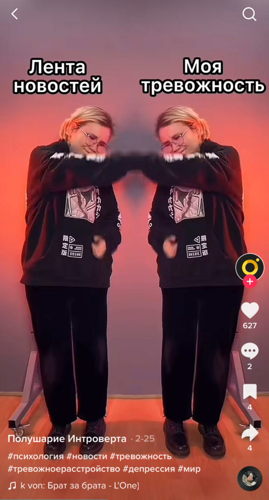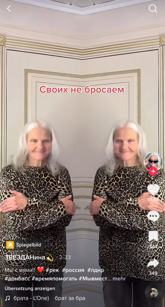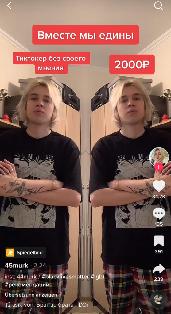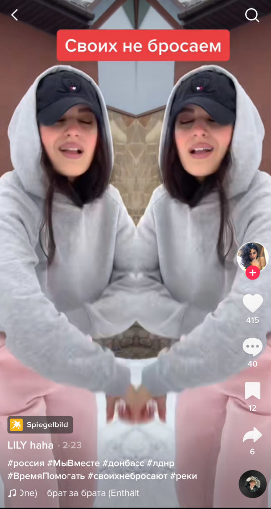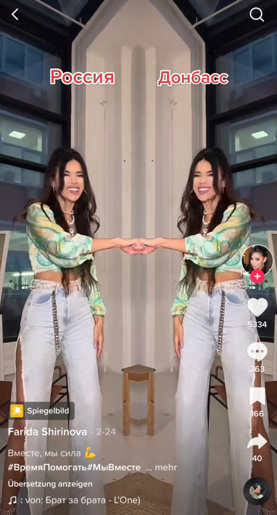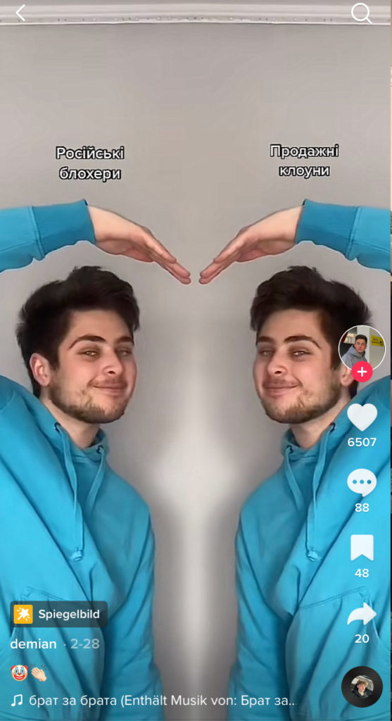 Хороший тому пример — мем с популярным в TikTok зеркальным фильтром. Пророссийские тиктокеры показывали через этот фильтр братство россиян и русскоговорящих жителей Донбасса. На видео они складывали руки в форме сердца, над одной половиной которого было написано «Россия», а над другой — «Донбасс». На фоне играла песня «Брат за брата» исполнителя L’One. Проукраинские тиктокеры подхватили этот тренд: используя все тот же зеркальный фильтр они иронично складывали руки в форме сердца, над одной половиной которого писали «тиктокер без мнения», а над другой — «2000 рублей», намекая на предположительную плату, за которую российские тиктокеры делают видео о братстве России и Донбасса.
