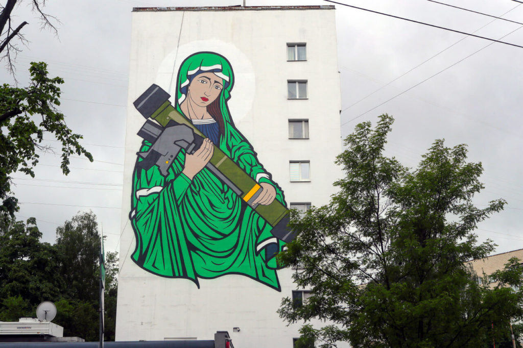 Символ движения — собака породы сиба-ину по кличке Фелла и мемы с ней. Еще один важный образ этой войны, ставший символом украинского сопротивления, — мем Святая Джавелина, на котором Мадонна держит американский противотанковый ракетный комплекс Джавелин. С этим мемом сделали мерч и организовали благотворительную распродажу. Организаторам удалось собрать миллион долларов на помощь людям, пострадавшим от насилия из-за войны в Украине.